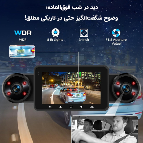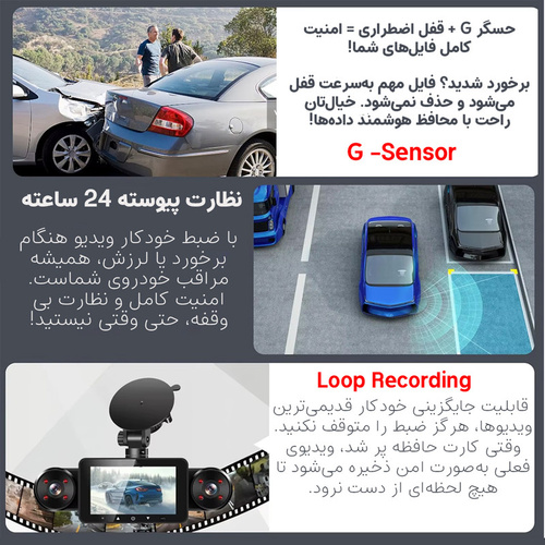 سایر توضیحاتبرای نصب دوربین کافیست آن را روی شیشه جلو خودرو محکم کنید، لنزهای جانبی و عقب را در زاویه دلخواه تنظیم کنید، کارت حافظه تا ۶۴ گیگابایت را داخل دستگاه قرار دهید، برق را از فندکی خودرو یا کیت برق مستقیم تأمین کنید، دستگاه همزمان با استارت خودرو روشن و با خاموش کردن خودرو بهطور خودکار خاموش میشود، سپس برای اتصال به موبایل WiFi دوربین را فعال کرده و با رمز 12345678 متصل شوید و از طریق اپلیکیشن Viidure تصاویر و تنظیمات را مدیریت کنید.